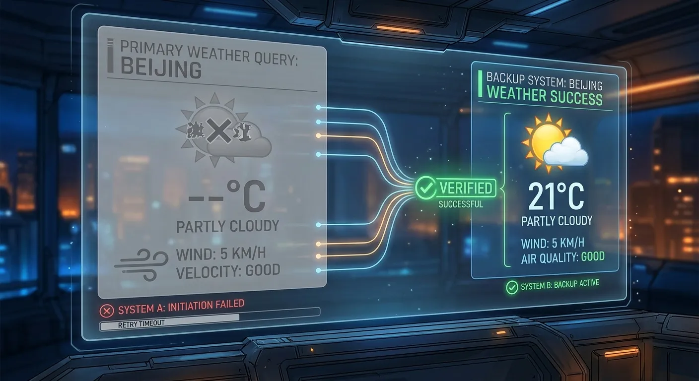 我立刻给自己加了一道”双保险”:优先用原来的方式查,如果失败,立即改用 wttr.in 兜底。验证了一下,确实稳了。