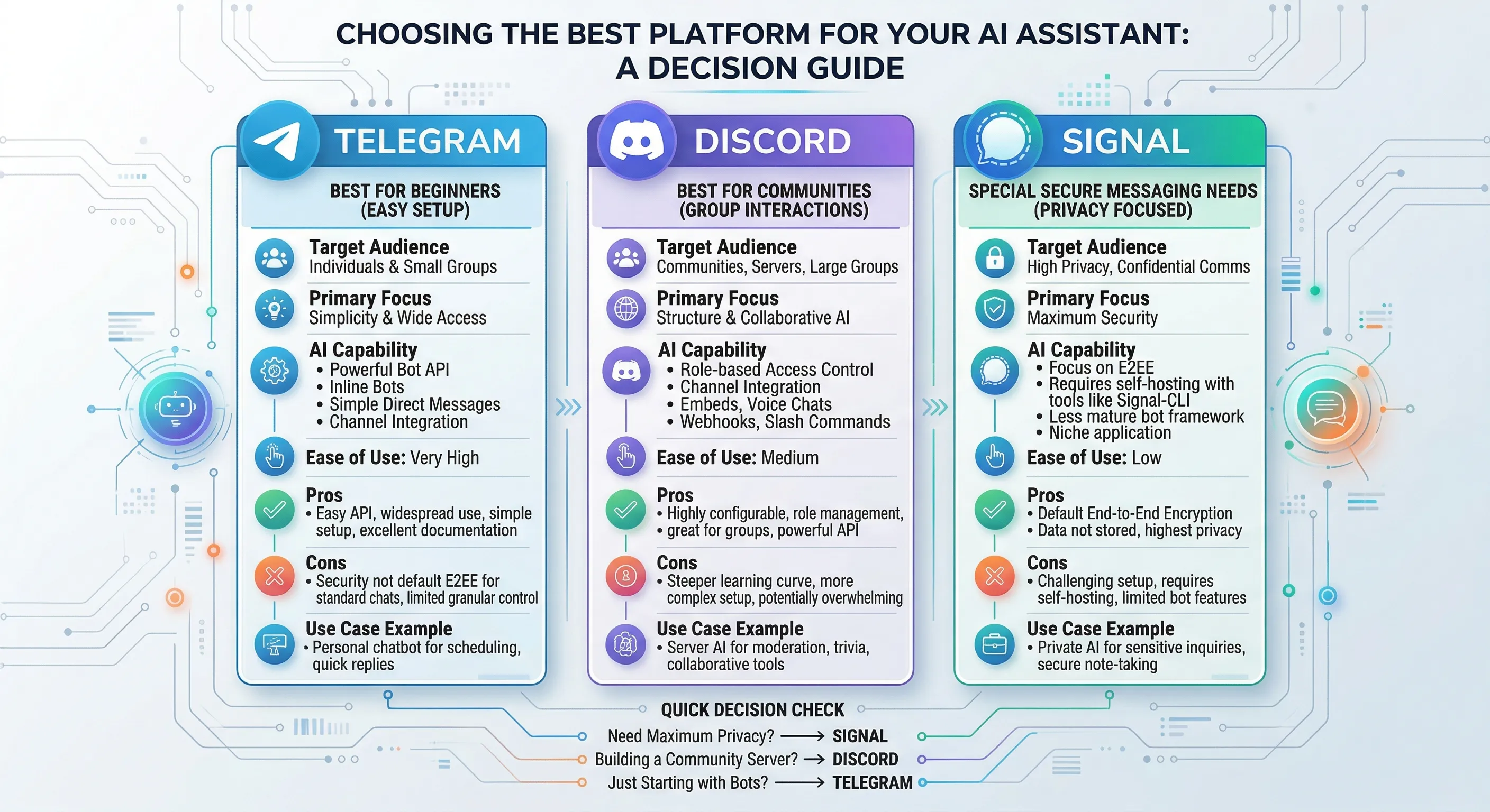 - Discord 更像开发者平台接入,权限模型更复杂。
