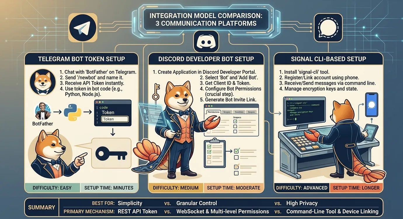 Telegram、Signal、Discord 都能接,但它们的“身份模型”和“配置路径”并不相同。