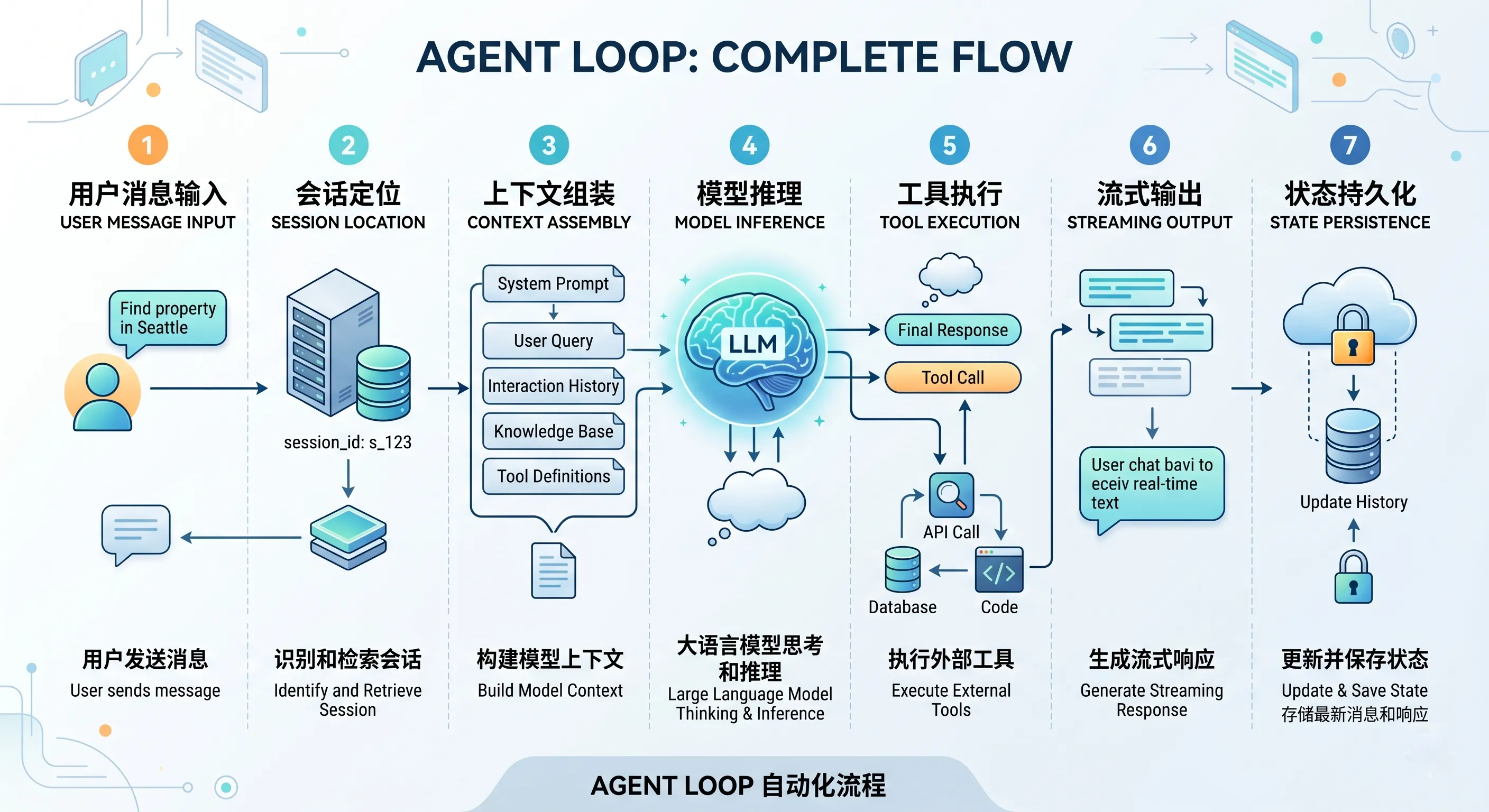 - 它包含消息进入、上下文组装、模型推理、工具执行、流式输出和状态持久化。