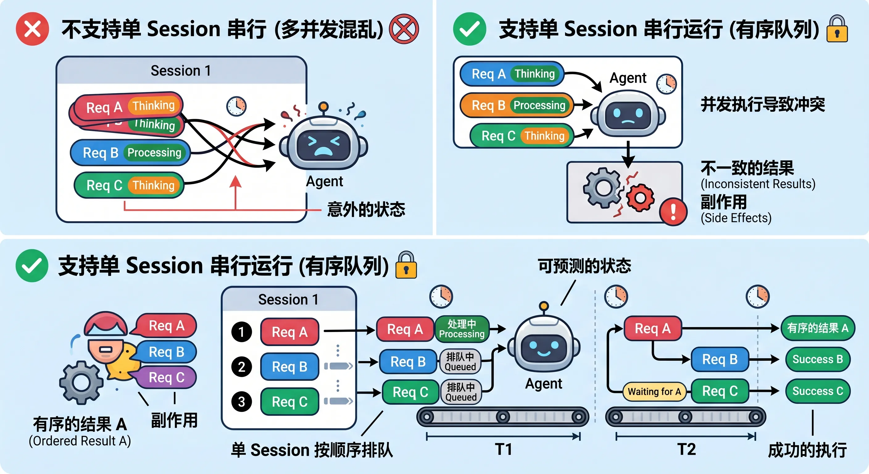 因为如果一个 Session 里允许多轮完全并发乱跑,结果很容易出现: